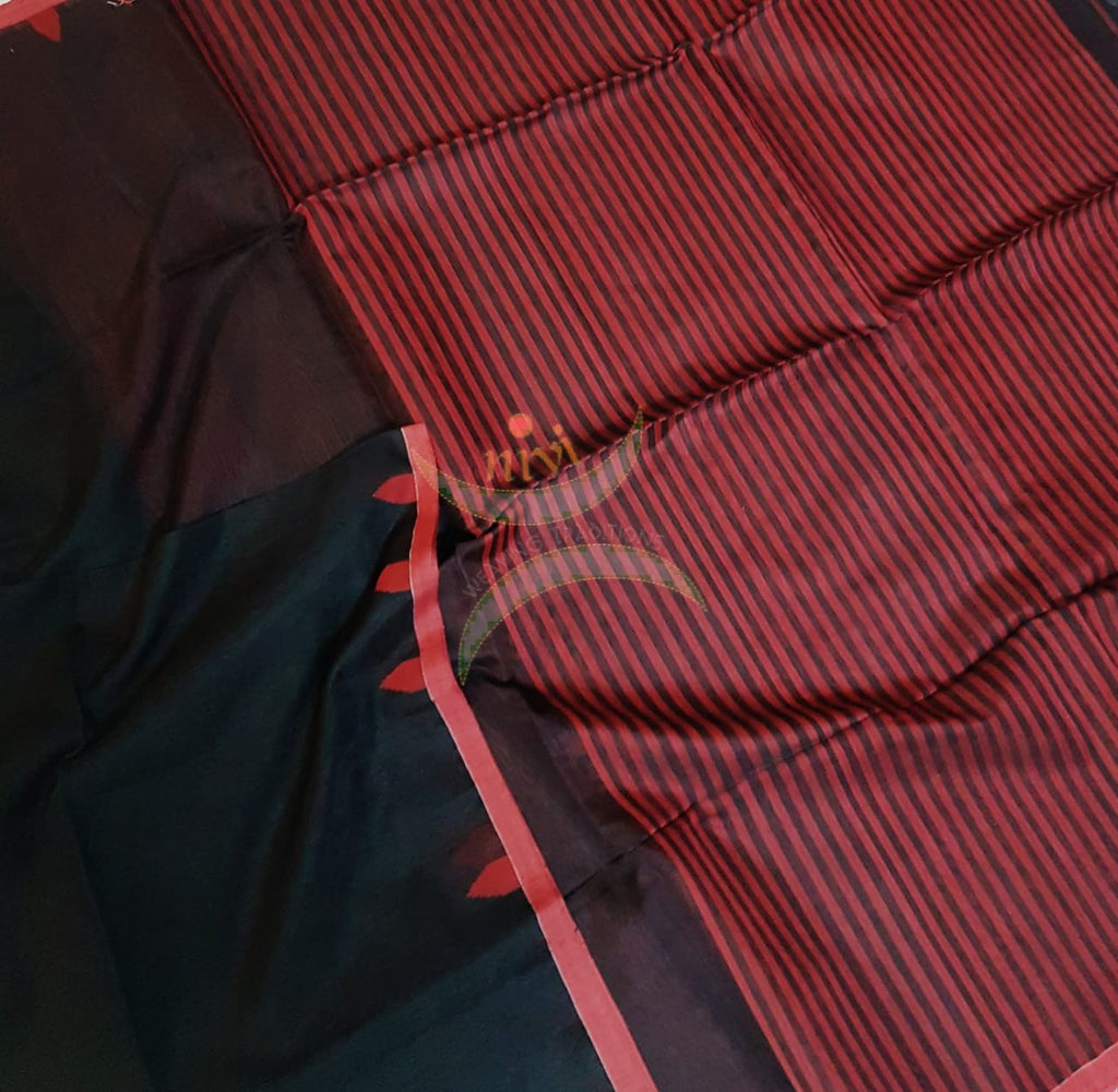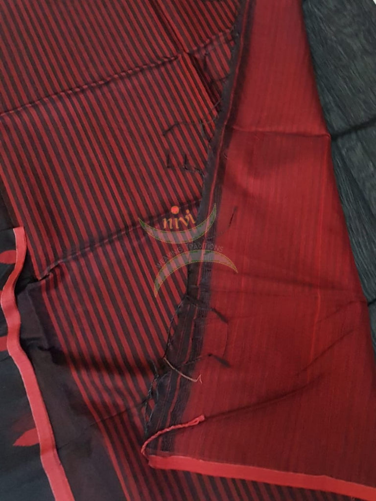 Black bengal cotton handloom with red border and pallu. Saree comes with contrasting blouse piece