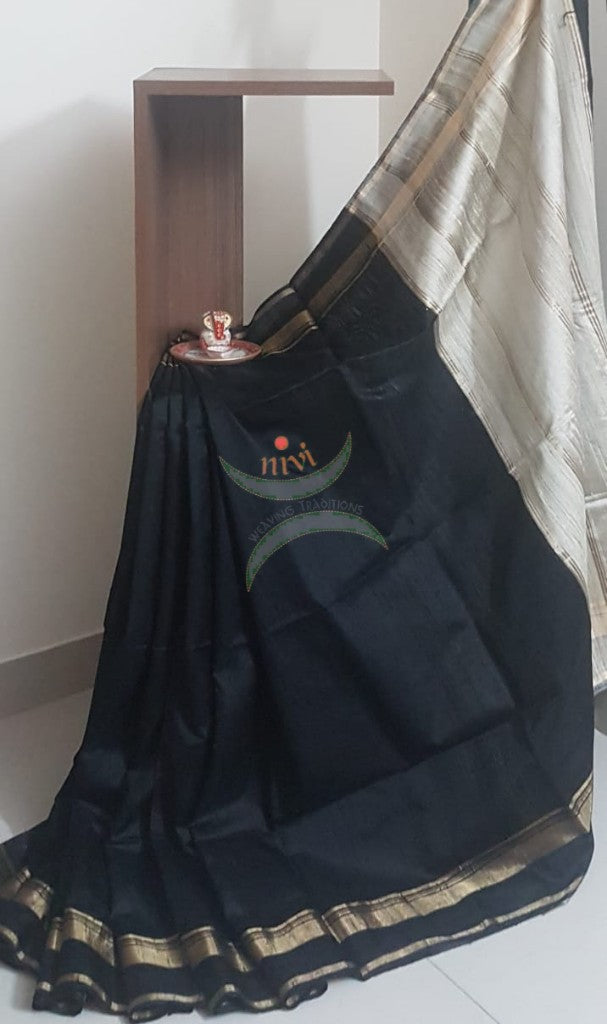 Black handloom dupion silk saree with contrasting blouse piece
