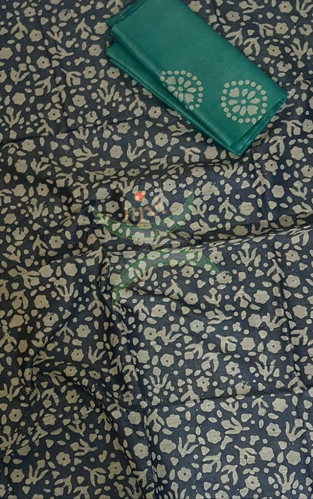 Charcoal grey with Green handloom silk blend batik printed 3 piece set