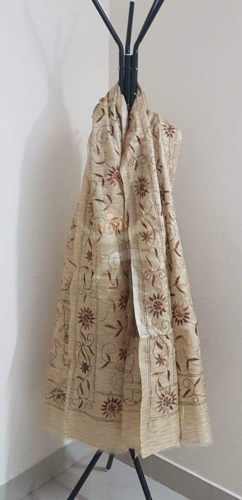 Beige Hand embroidered kantha dupattas on paper silk with brown coloured floral motif.