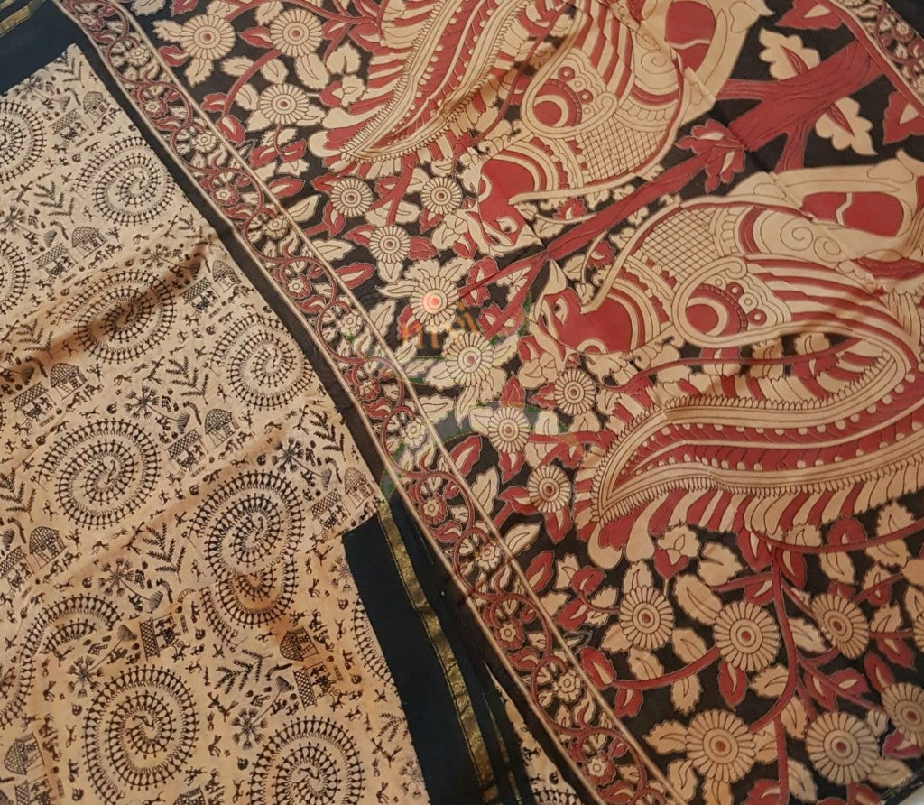 Cream Handloom chanderi hand block printed saree with warli art. Saree comes with plain blouse piece