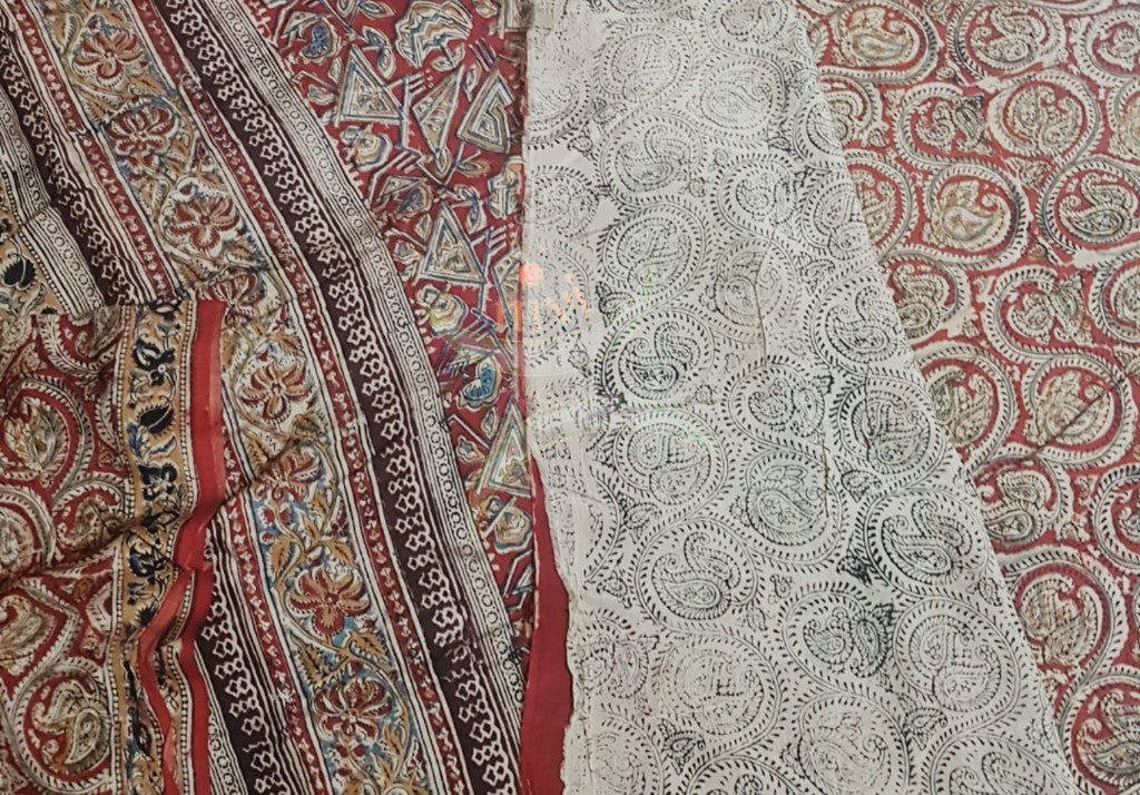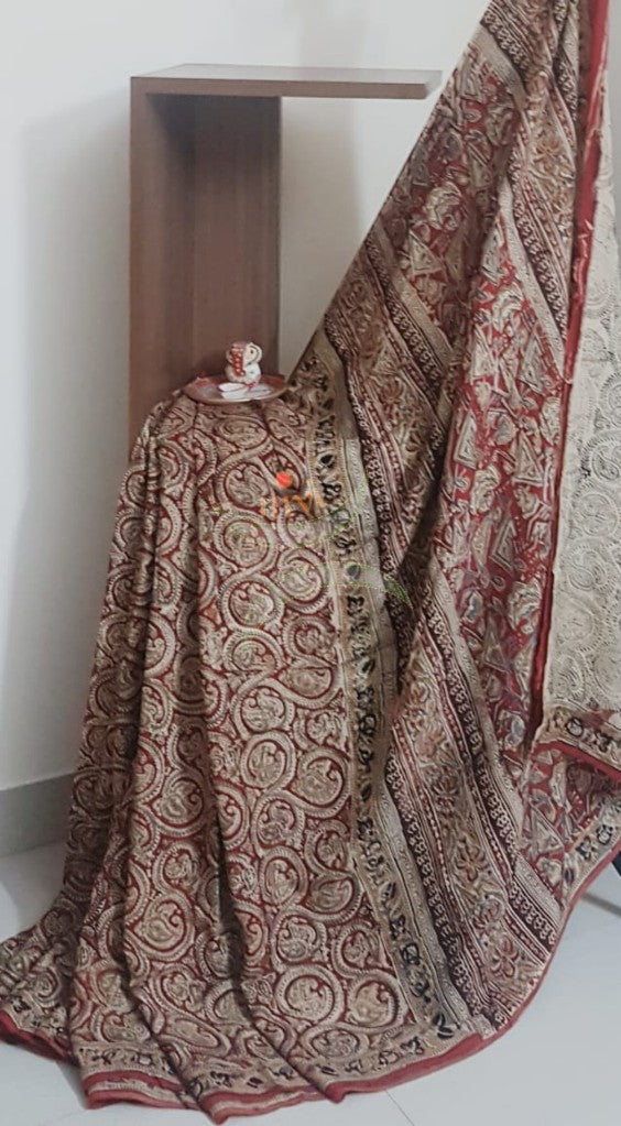Handloom red chennur silk kalamkari saree. Saree comes with printed kalamkari blouse piece