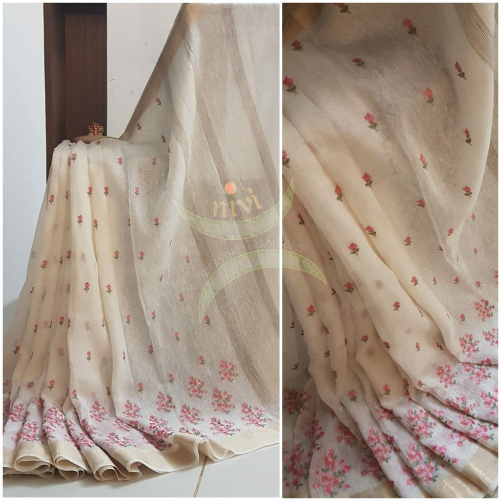 Off white linen silk handloom with embroidery. Saree comes with running blouse piece