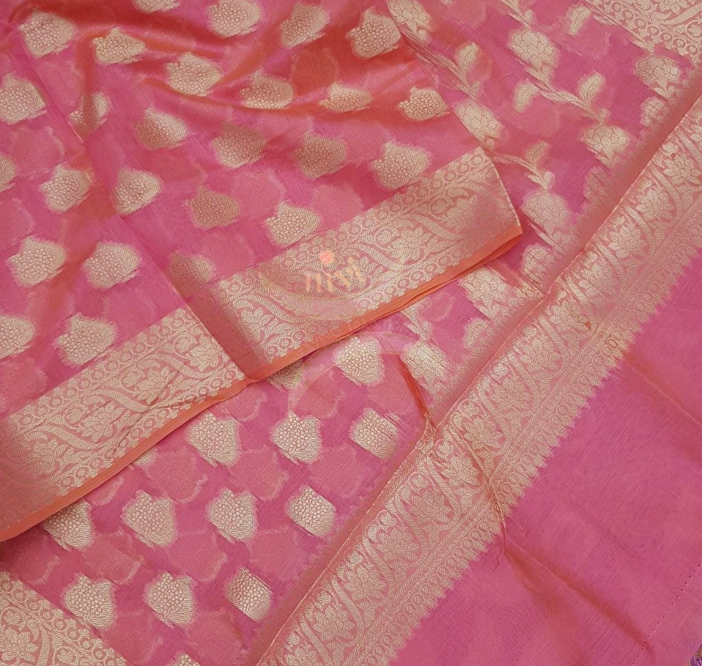 Pink chanderi benaras brocade duppata with all over jacquard weaving.