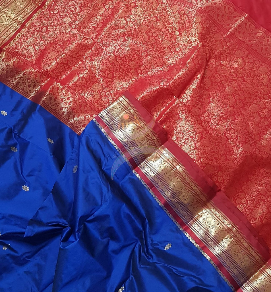 Royal blue with red handloom small Ghatti border pure south silk saree.