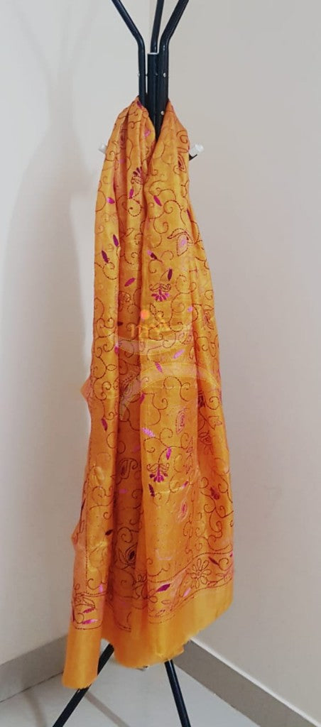 Yellow Hand embroidered kantha dupattas on paper silk with shades of pink floral motif.