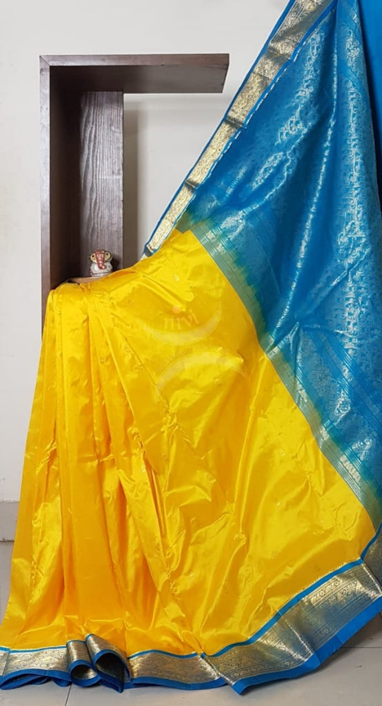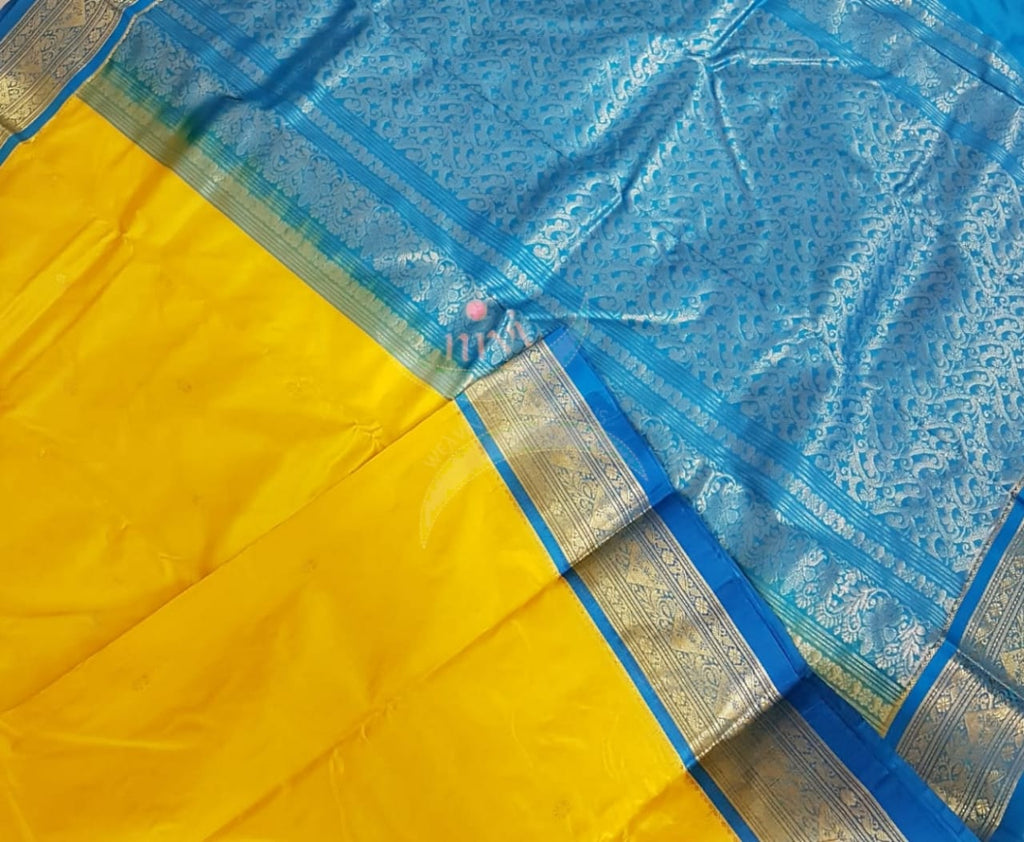 Yellow with blue handloom small Ghatti border pure south silk saree.