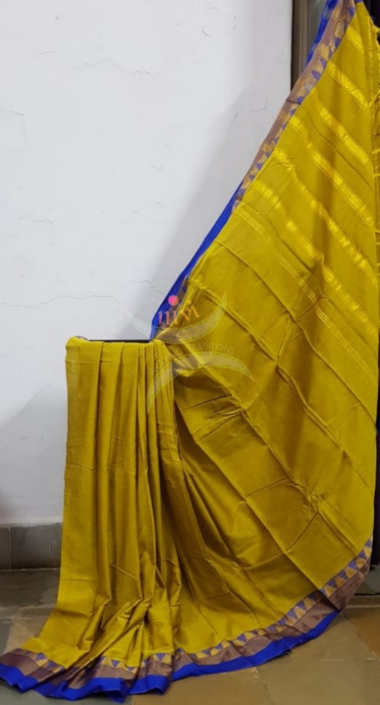Yellowish green mercerised South cotton with contrasting blue woven temple border