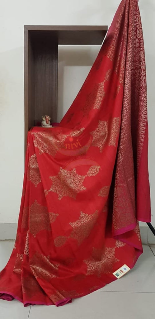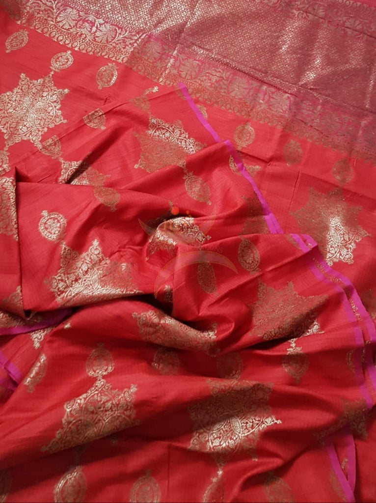 Pure Dupion silk benaras brocade with antique zari . Saree comes with blouse.
